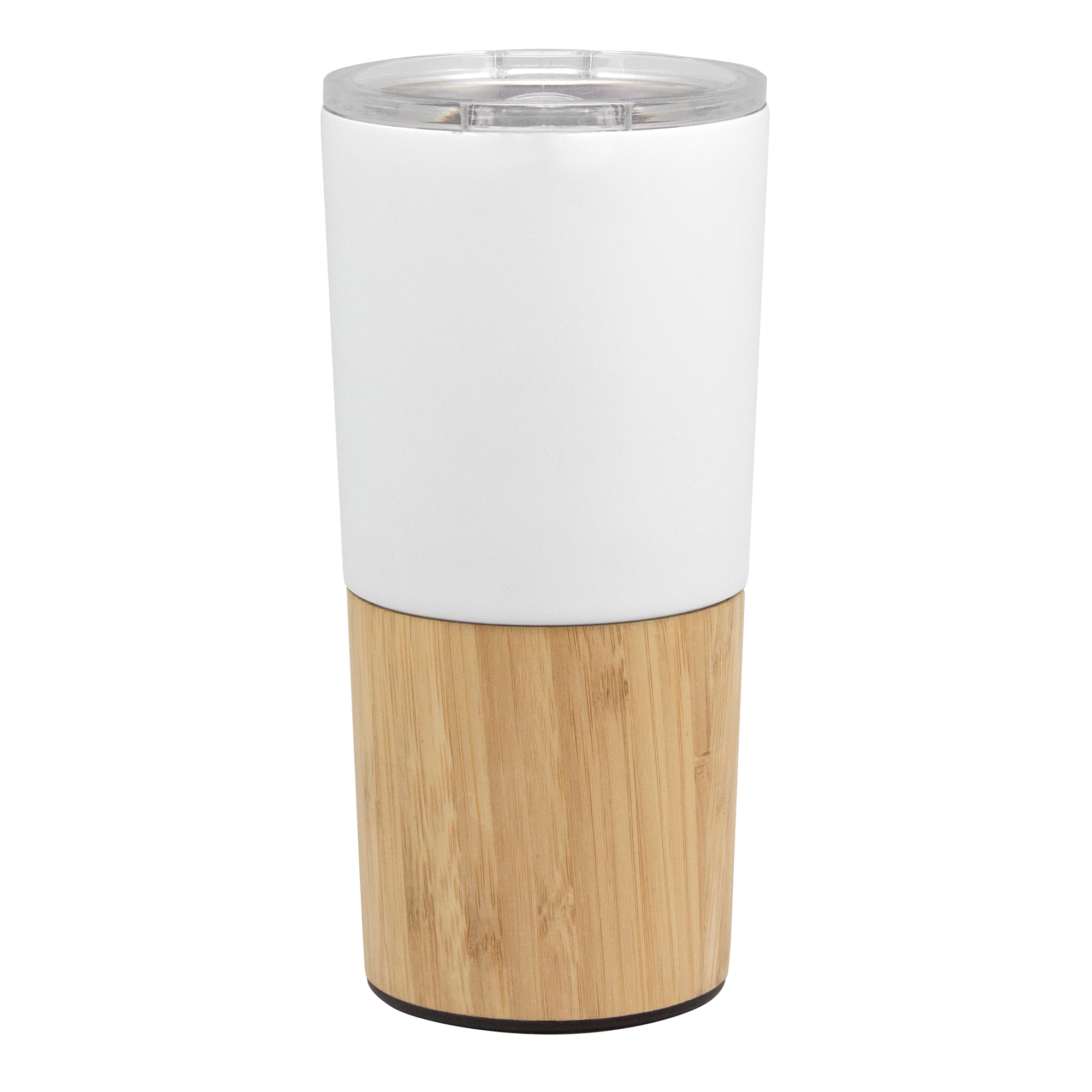 Mug doble pared, sellado al vacío. Interior en acero 304 / exterior en acero 201, con detalles de Bambú. Tapa plástica transparente a presión con anillo de silicona. Mantiene hasta 12 hs la temperatura de las bebidas calientes y 24 hs de las bebidas frías.