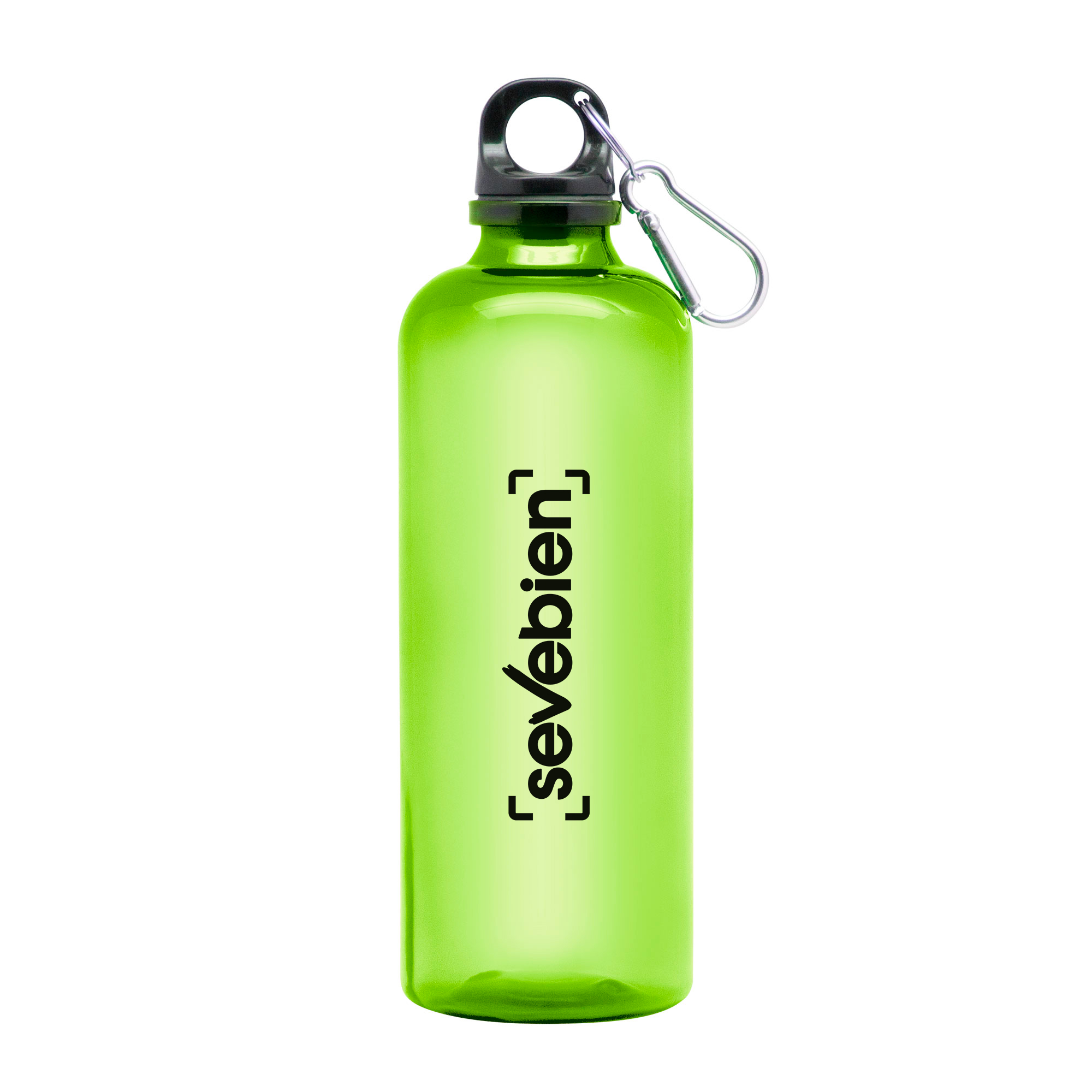 Ø 7 x 23 cm. Capacidad 600 ml. Material PET. Botella de plástico de colores translúcidos. Tapa a rosca en color negro con anillo de silicona y mosquetón de aluminio plata. Ultra liviana, pesa 60g.