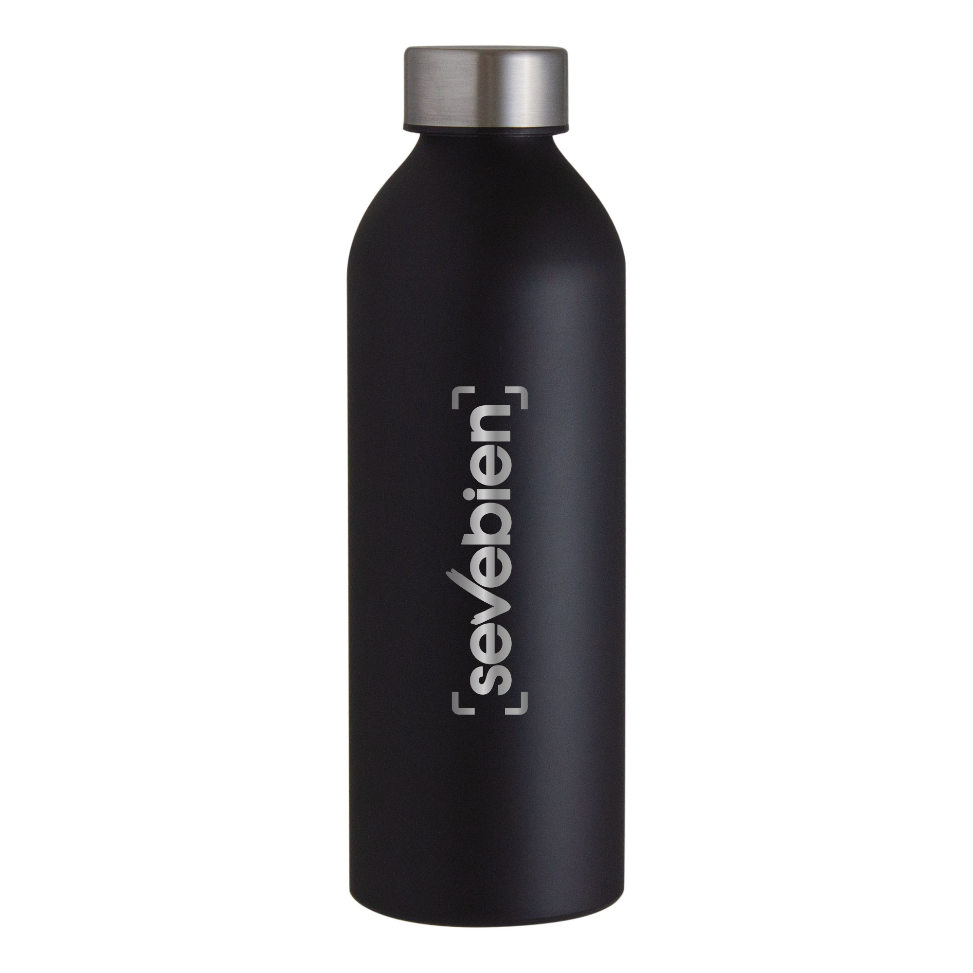 Botella de aluminio con acabado mate. Tapa a rosca color plata en acero inoxidable 201 y anillo de silicona antiderrame.