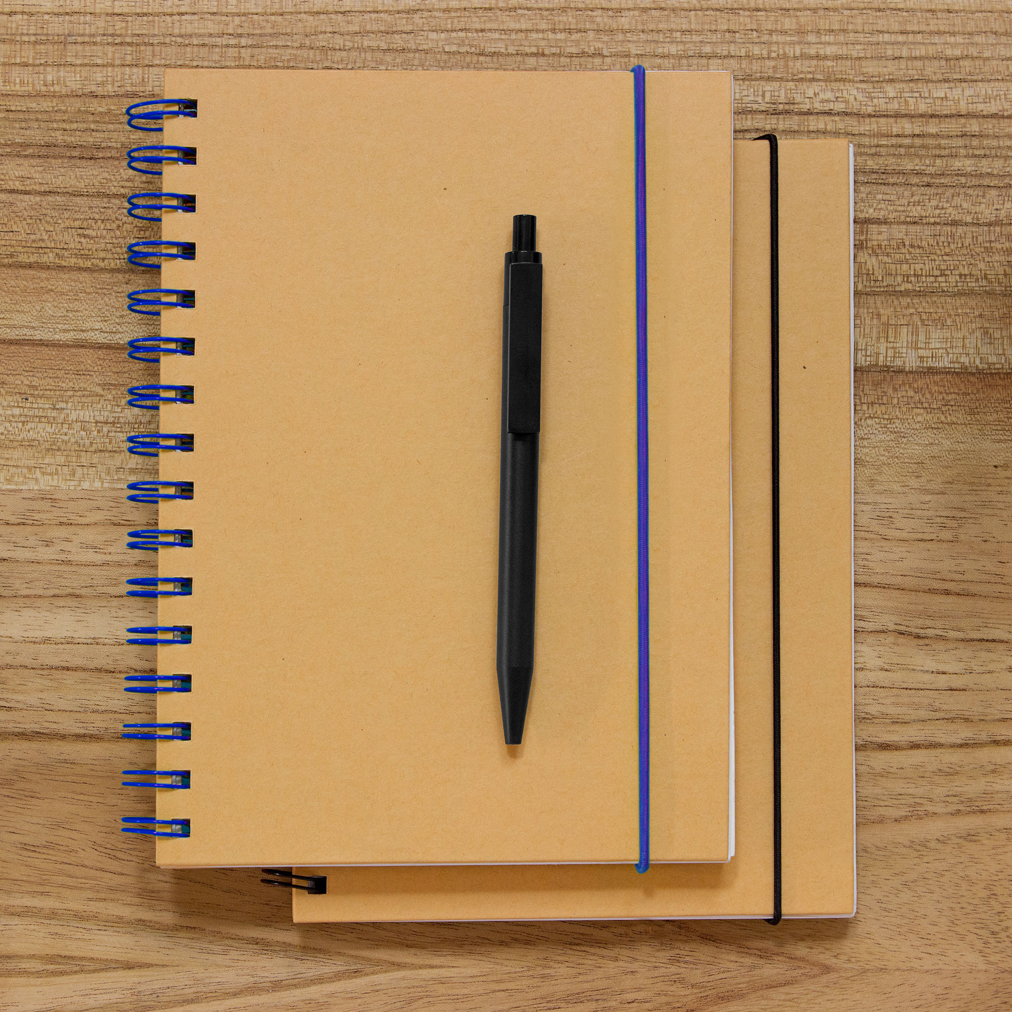 Libreta espiralada. Tapa recubierta en papel kraft de 120 g. Interior de 70 hojas blancas rayadas de 80 g. Cierre con banda elástica y espiral del mismo color.