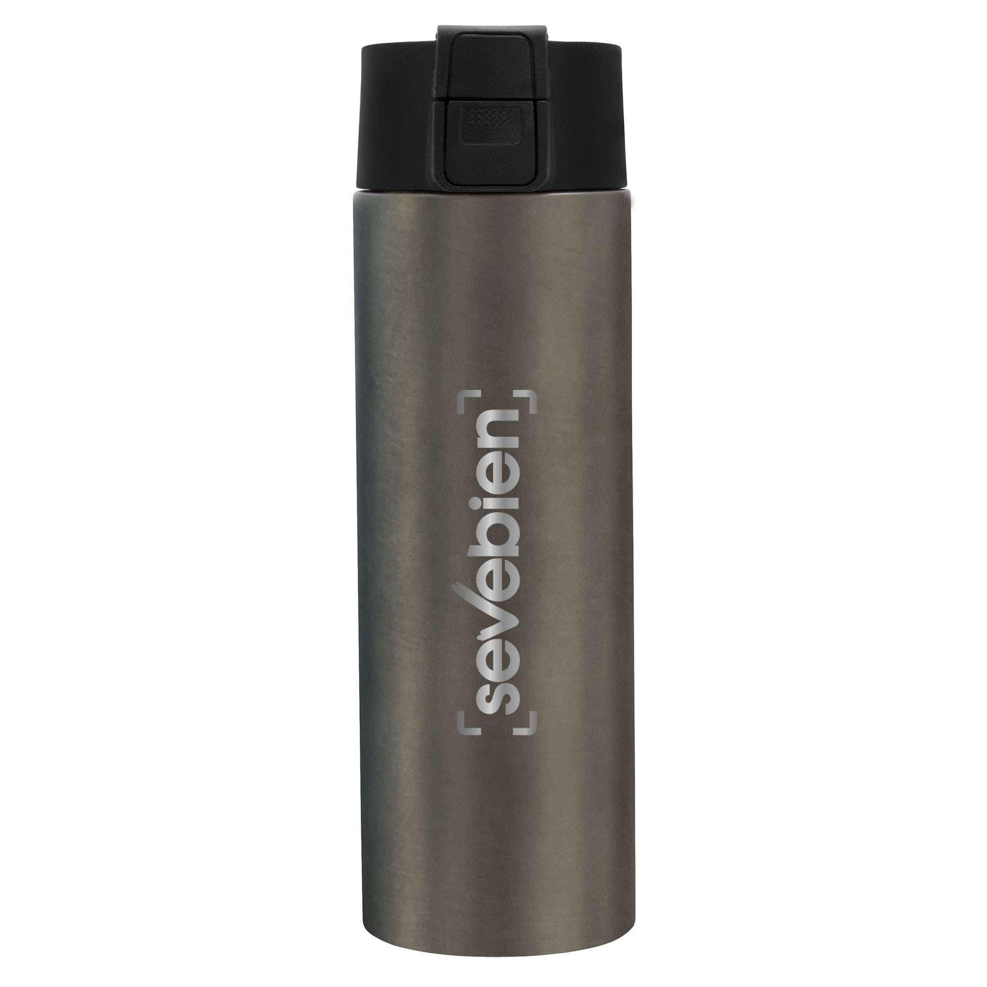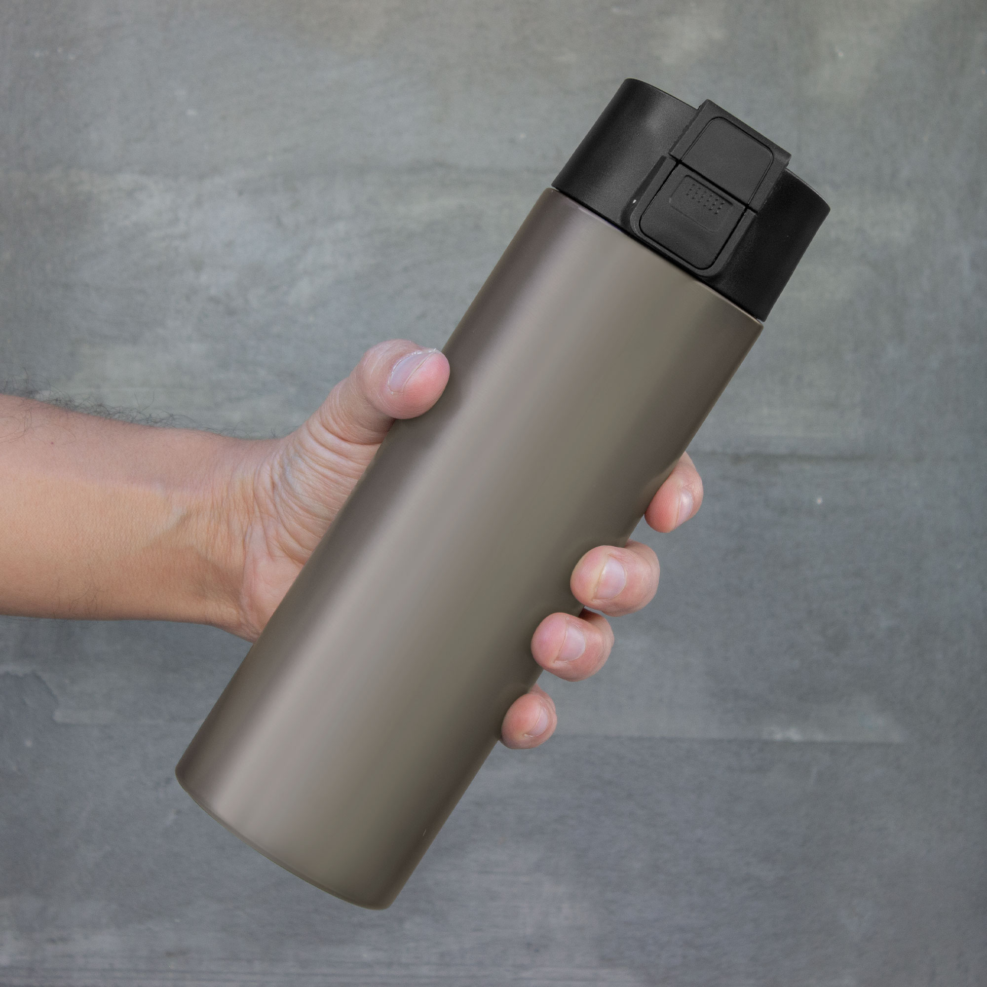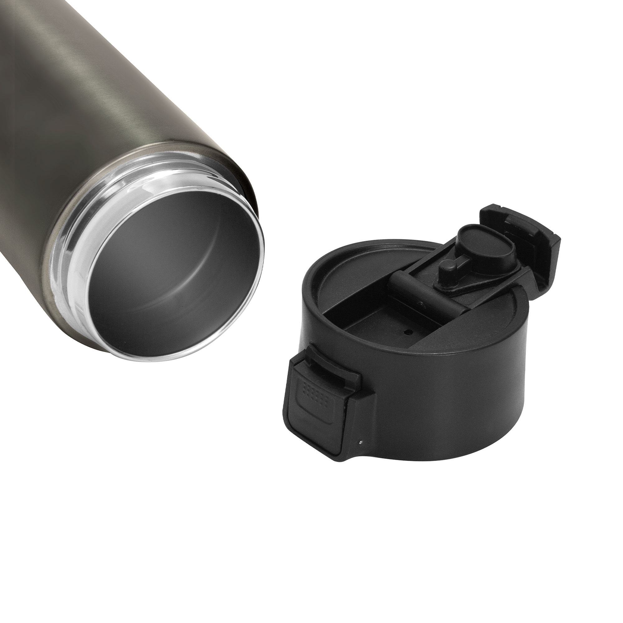 Ø 7 cm x 23 cm. Acero inoxidable. Capacidad 450 ml. Botella doble pared, sellada al vacío. Interior de acero 304 y exterior de acero 201. Pintura acabado mate. Tapa en PP con traba de seguridad y botón pulsador de apertura. Mantiene por más de 12 hs la temperatura de las bebidas calientes y 24 hs de las bebidas frías. Presentación en caja de regalo kraft.