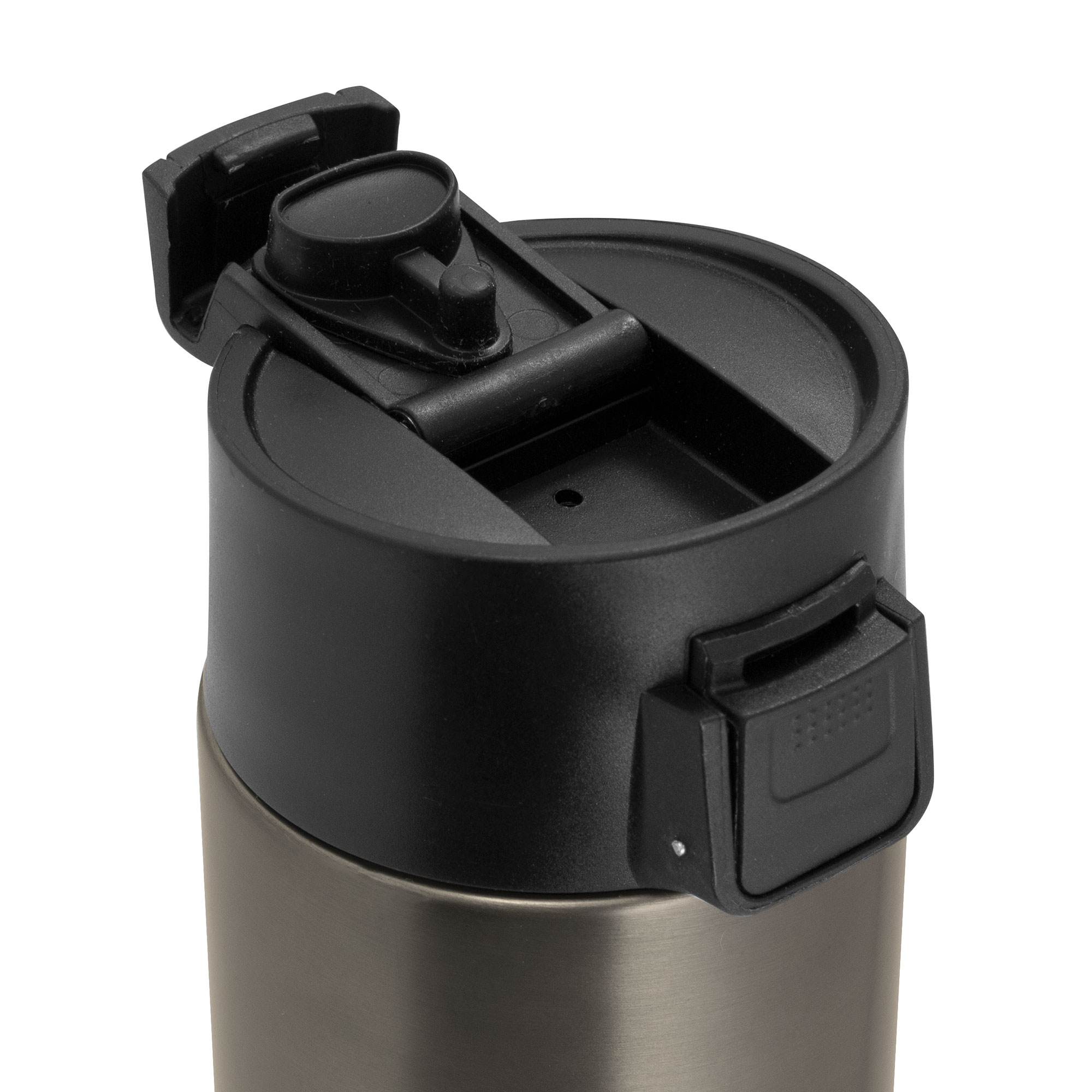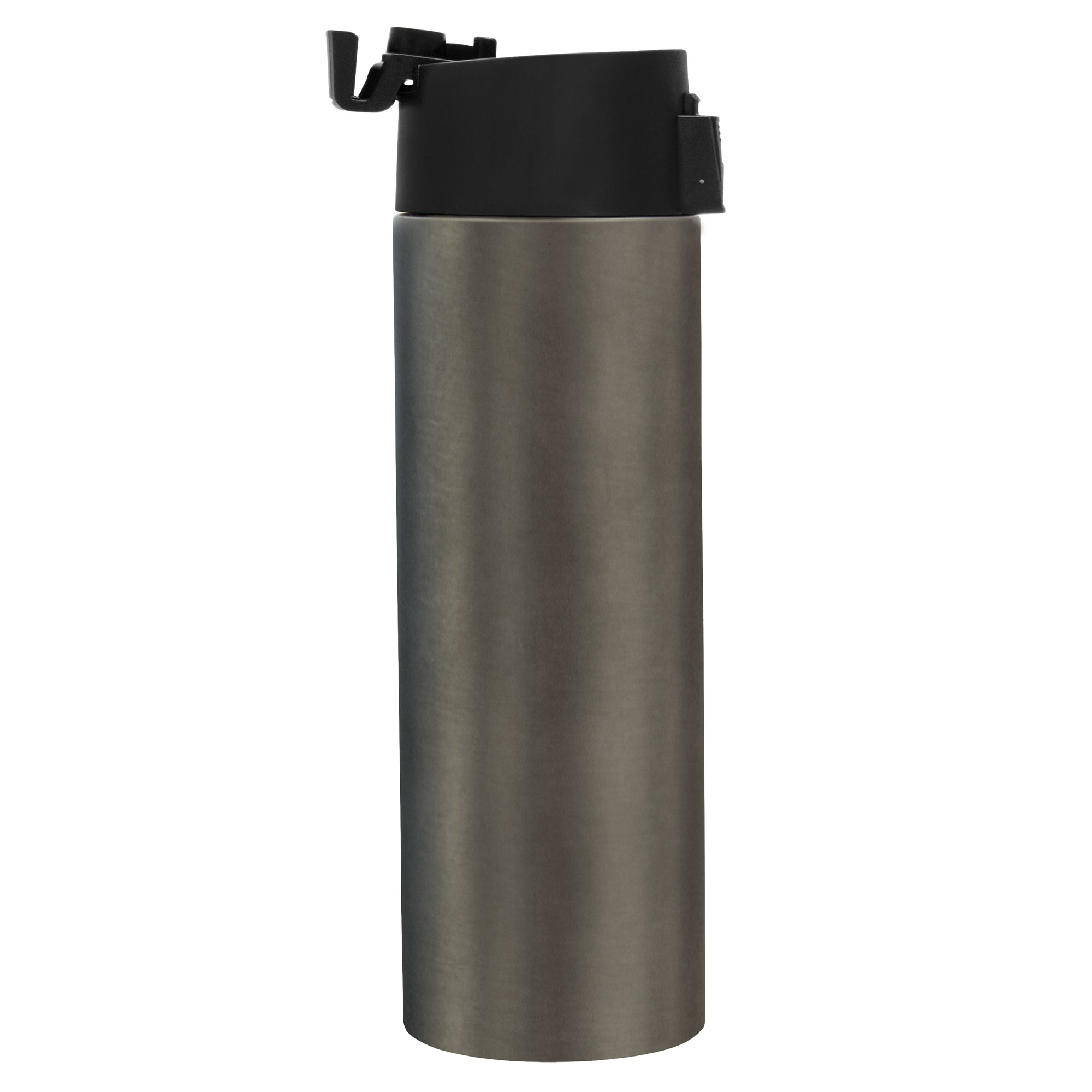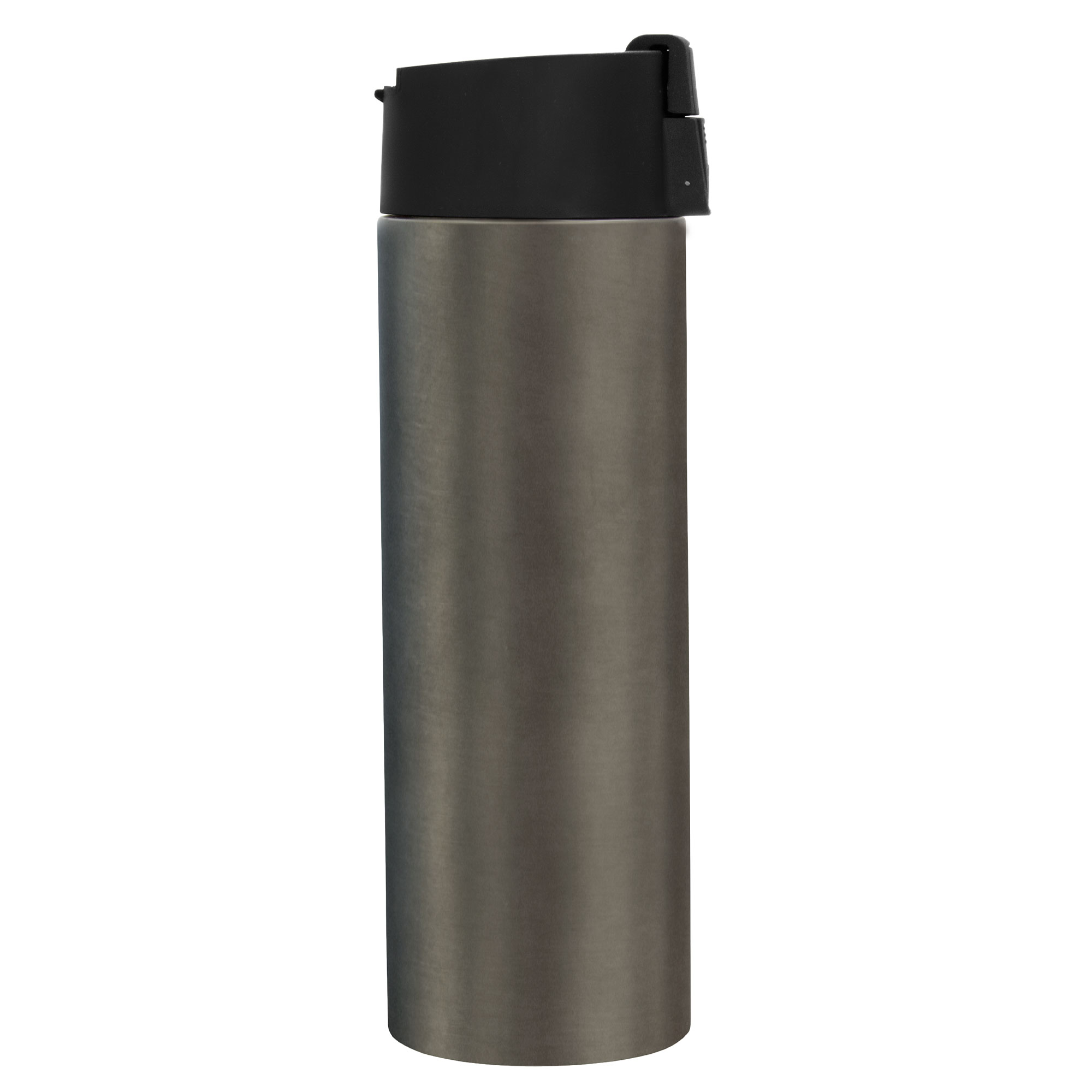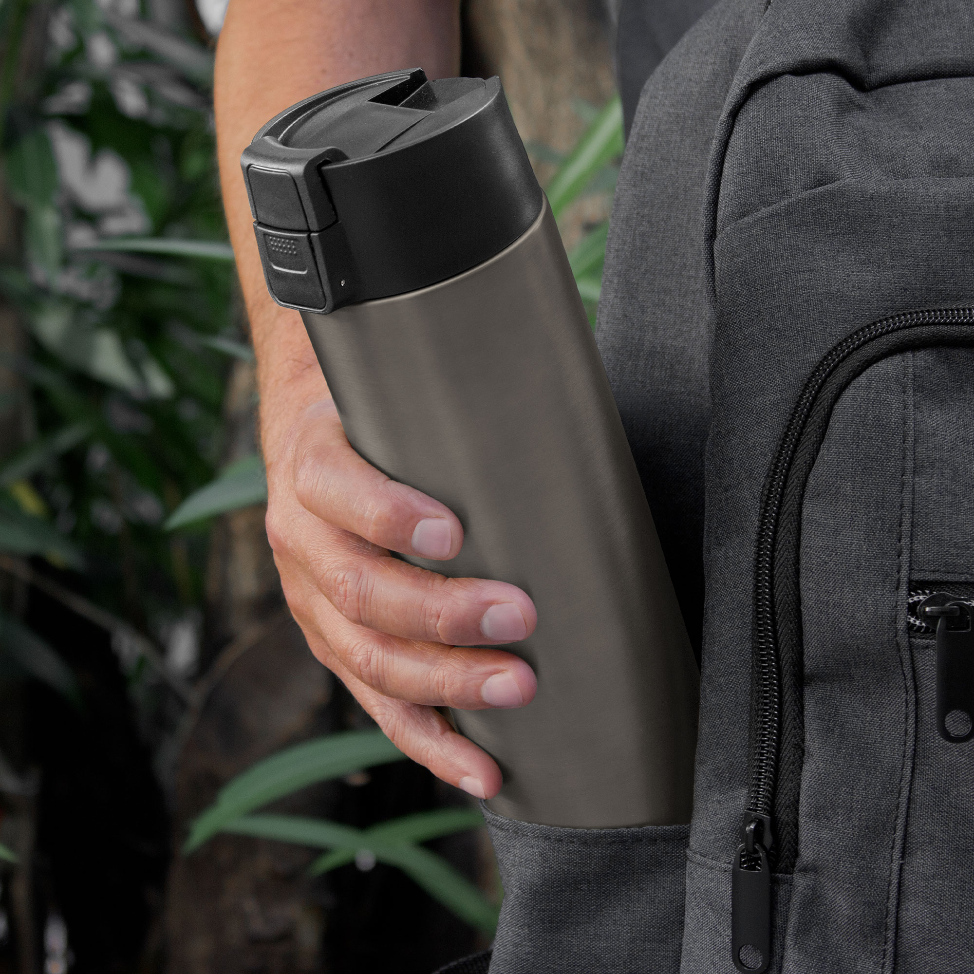 Ø 7 cm x 23 cm. Acero inoxidable. Capacidad 450 ml. Botella doble pared, sellada al vacío. Interior de acero 304 y exterior de acero 201. Pintura acabado mate. Tapa en PP con traba de seguridad y botón pulsador de apertura. Mantiene por más de 12 hs la temperatura de las bebidas calientes y 24 hs de las bebidas frías. Presentación en caja de regalo kraft.