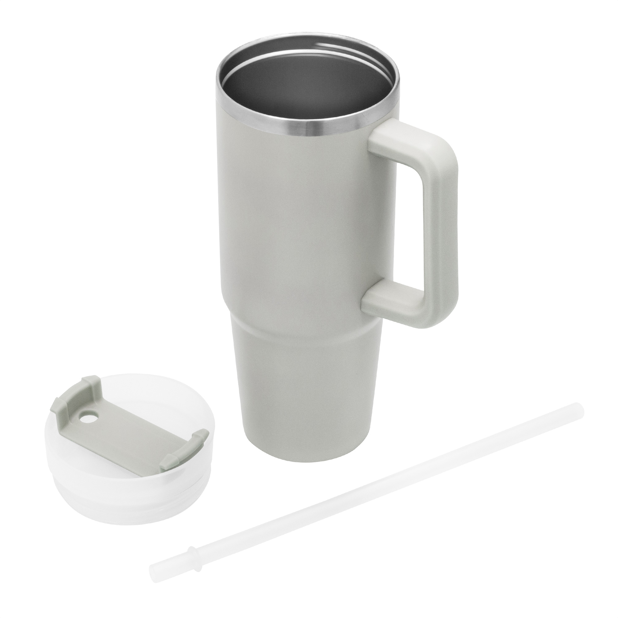 Mug doble pared, sellado al vacío con sorbete. Tecnología Vacuum. Interior en acero 304 y exterior en acero 201. Tapa plástica transparente a rosca con anillo de silicona. Cierre giratorio porta sorbete. Sorbete plástico translucido. Pintura exterior con acabado mate. Mantiene hasta 12 hs la temperatura de las bebidas calientes y 24 hs de las bebidas frías.