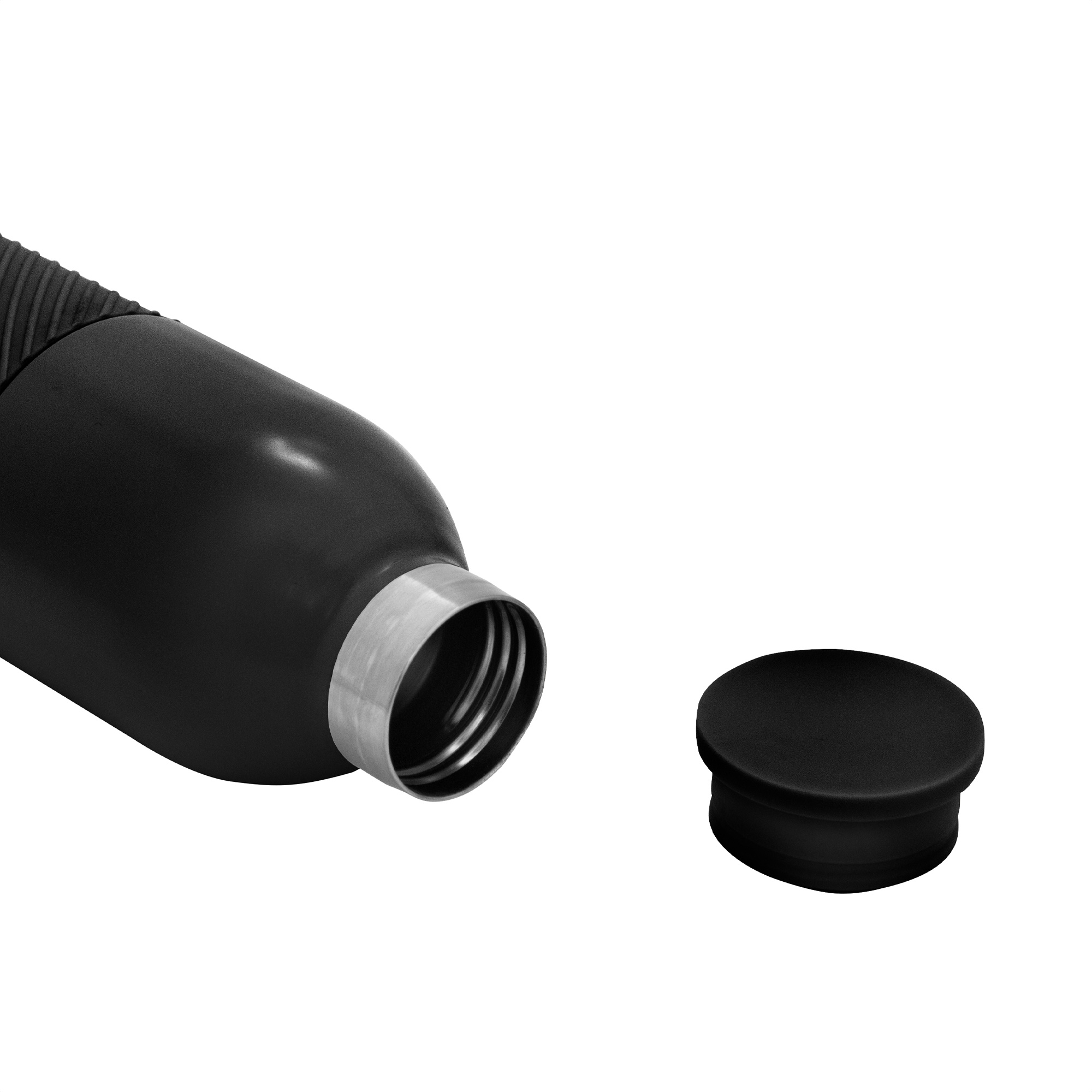 Ø 7 cm x 26,5 cm. Capacidad 600 ml. Acero inoxidable. Botella doble pared, sellada al vacío. Interior en acero 304 y exterior en acero 201. Grip de silicona texturado para mejor agarre. Pintura acabado mate. Tapa de polipropileno y acero inoxidable 201. Presentación en caja de regalo kraft.