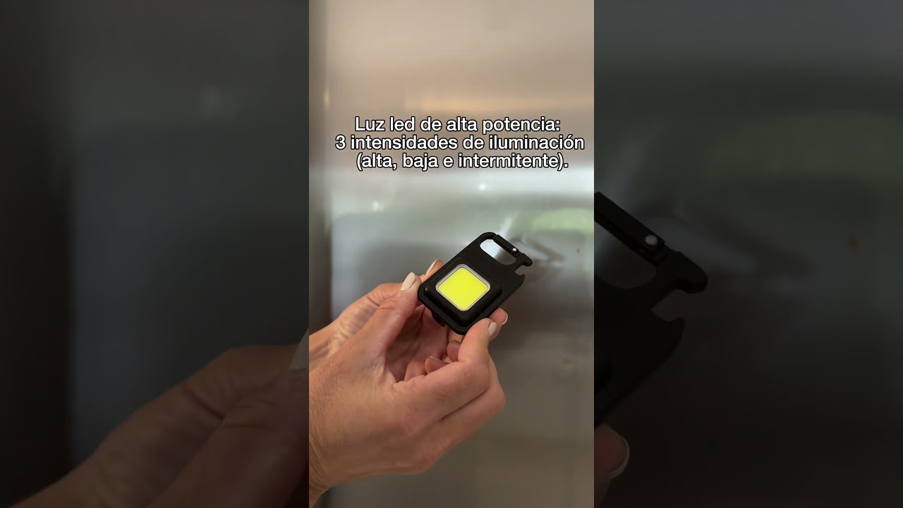 Linterna portátil recargable. Con destapador y mosquetón incorporado. Imán al dorso y soporte con pie para diferentes posiciones. Luz led de alta potencia: 3 intensidades de iluminación (alta, baja e intermitente). Batería recargable de 300 mAh. Luz led indicadora de carga. Puerto USB-C y cable de carga de 30 cm de largo color negro.
