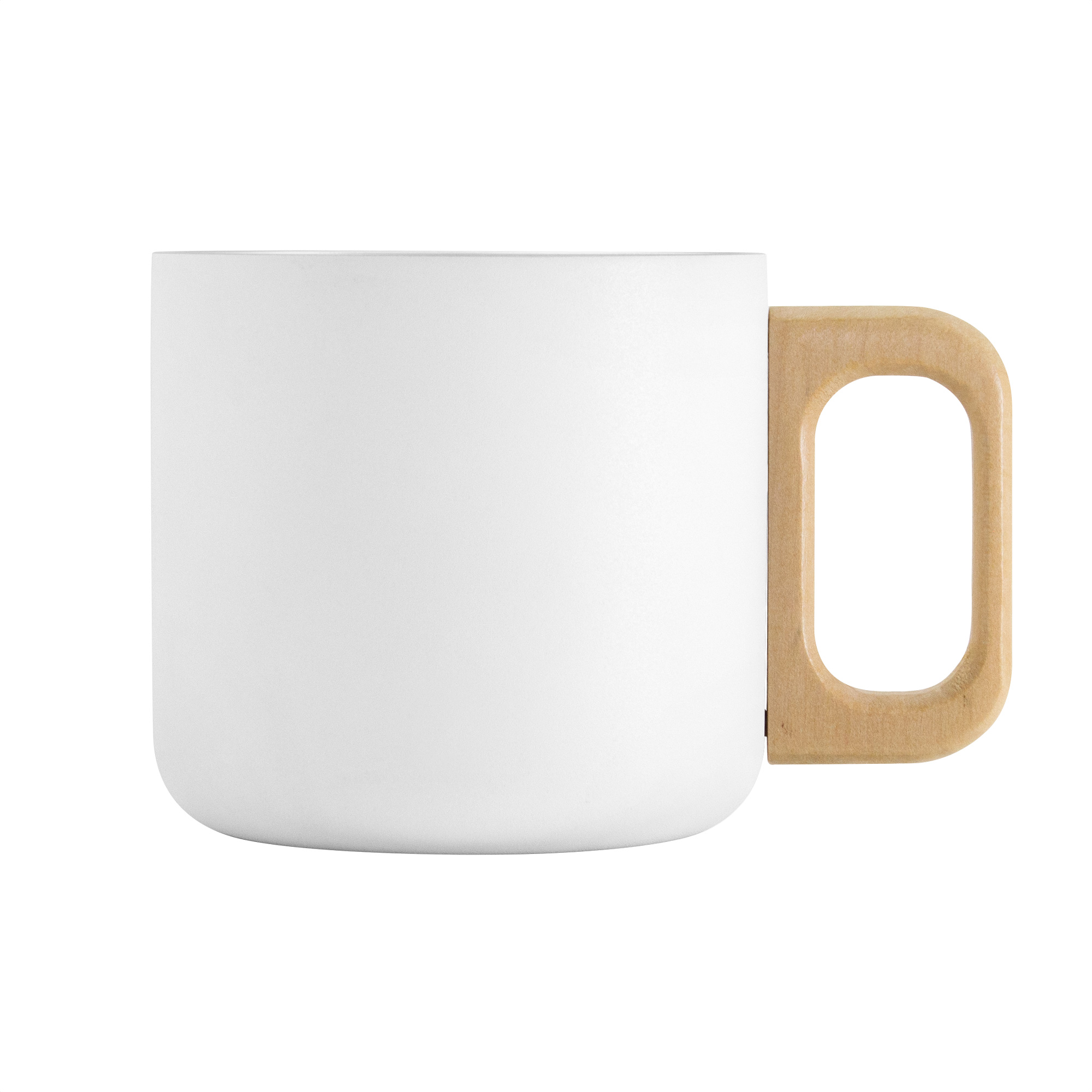 Taza doble pared, sin sellado al vacío. Interior de acero 304 y exterior de acero 201. Asa de madera color natural.  Pintura powder coat (pintura más duradera y resistente a la corrosión y el paso del tiempo). Mantiene las bebidas frías o calientes por más tiempo.