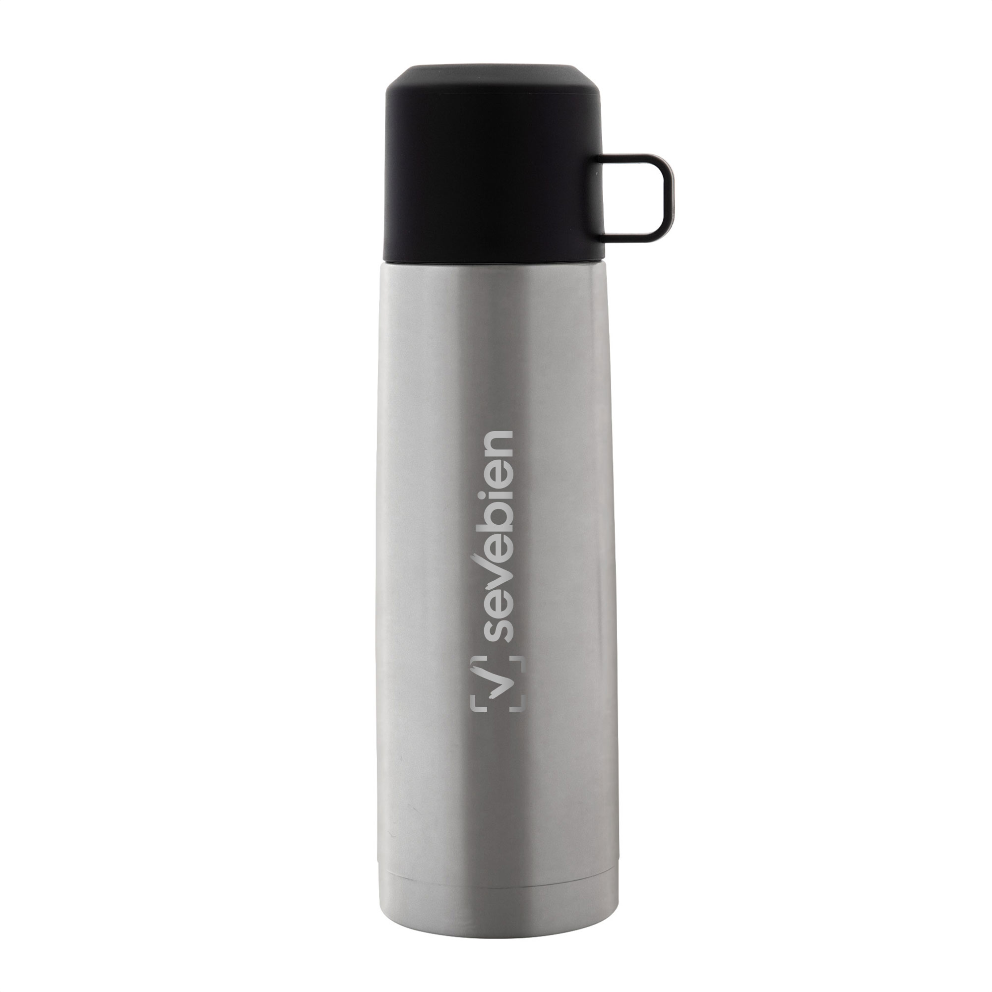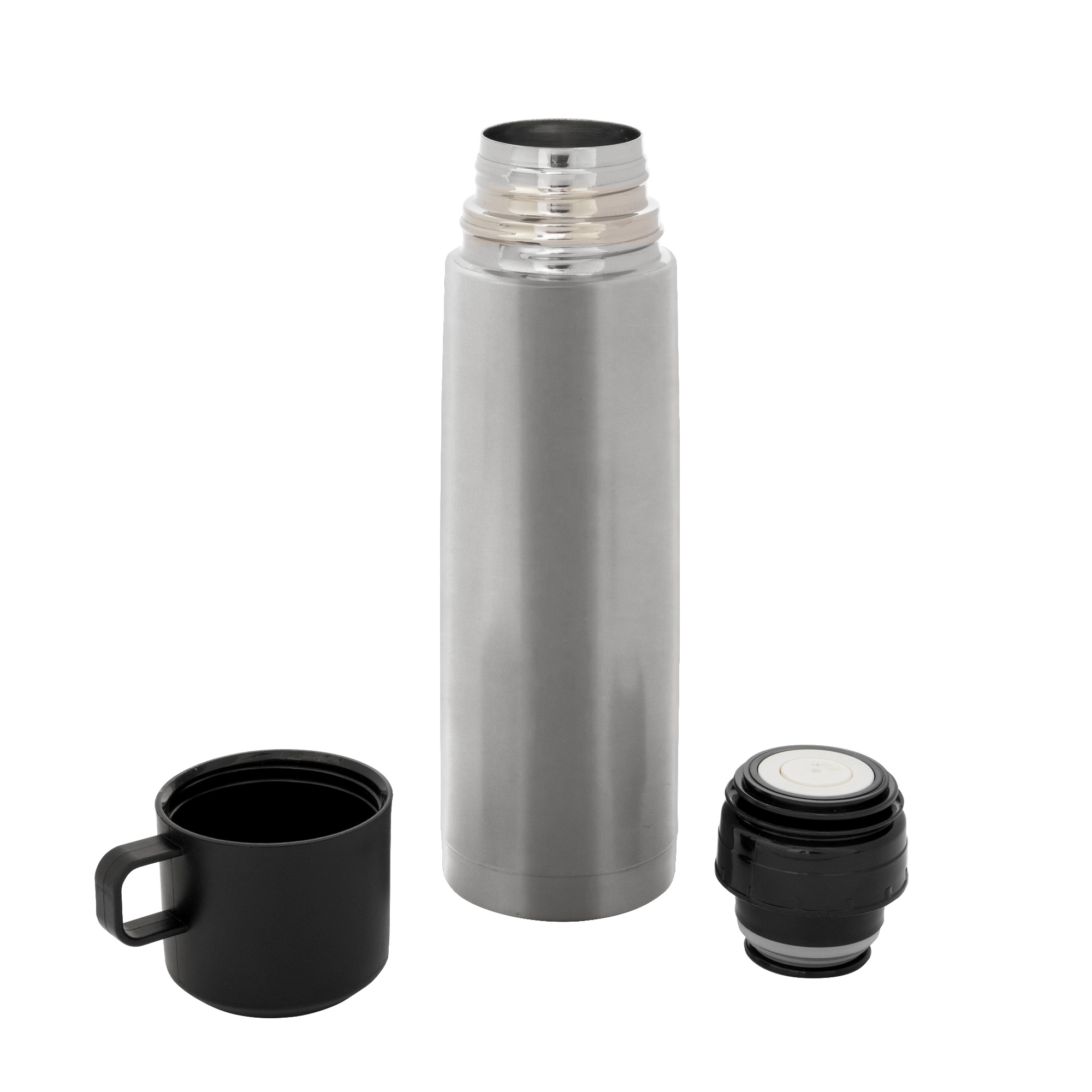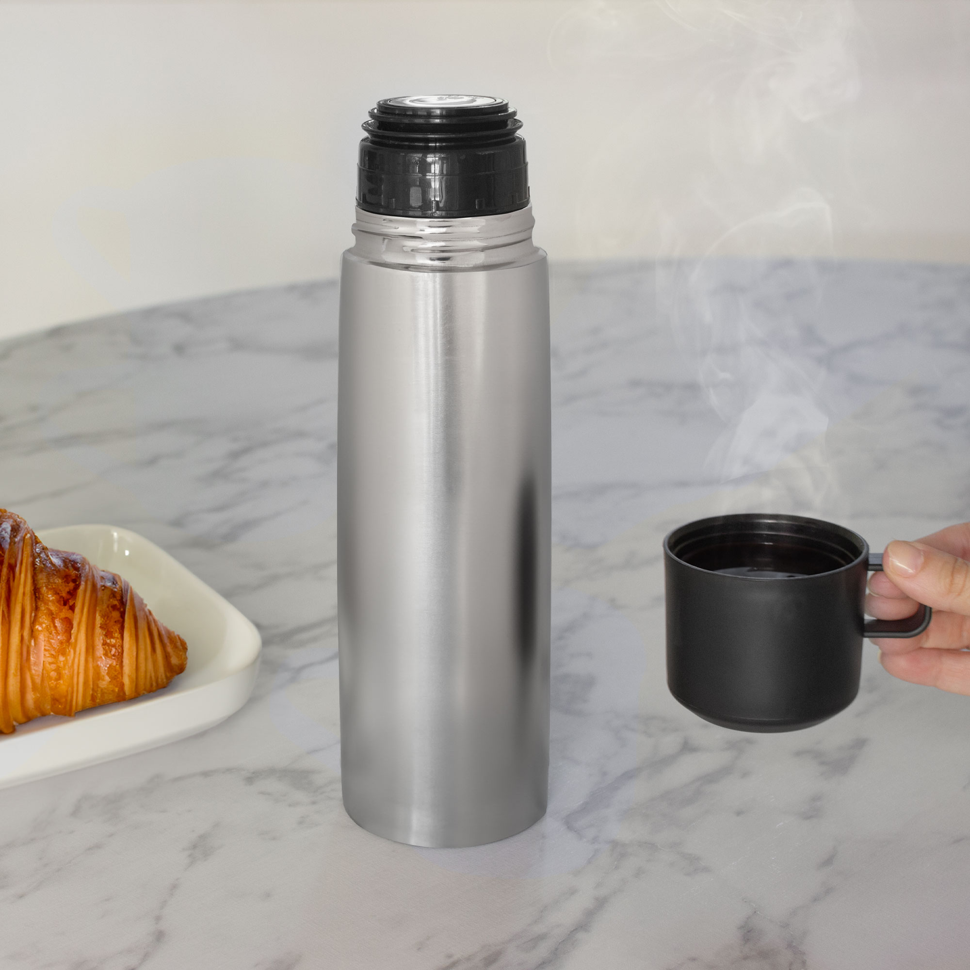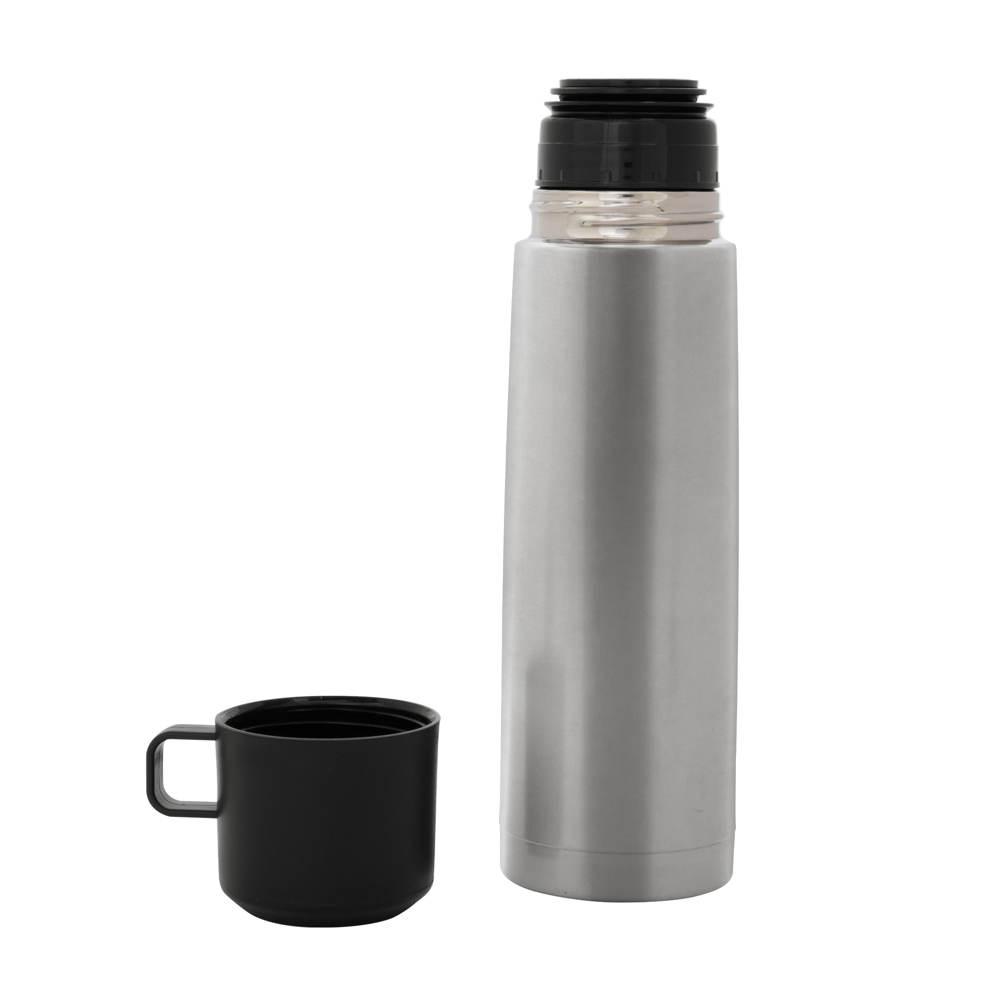 Termo con doble pared sellado al vacío. Tecnología vacuum. Acero inoxidable 304 interior / 201 exterior. Tapa y taza plásticas en color negro. Pintura acabado mate. Mantiene hasta 6 hs la temperatura de las bebidas calientes y 12 hs de las bebidas frías.