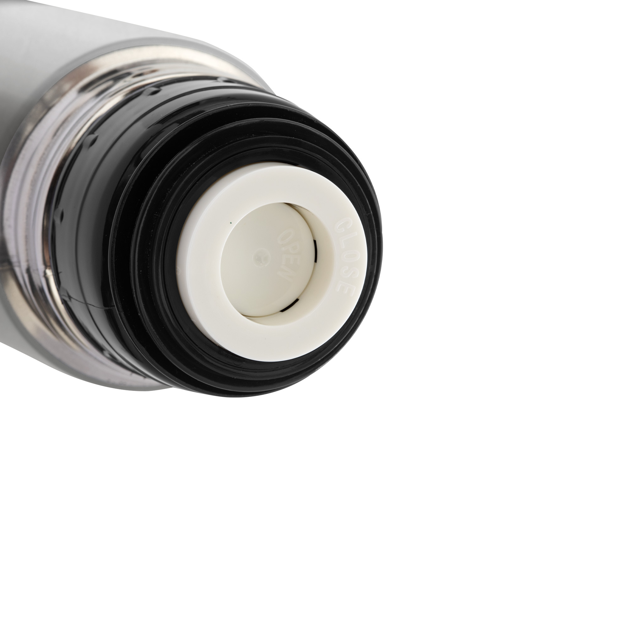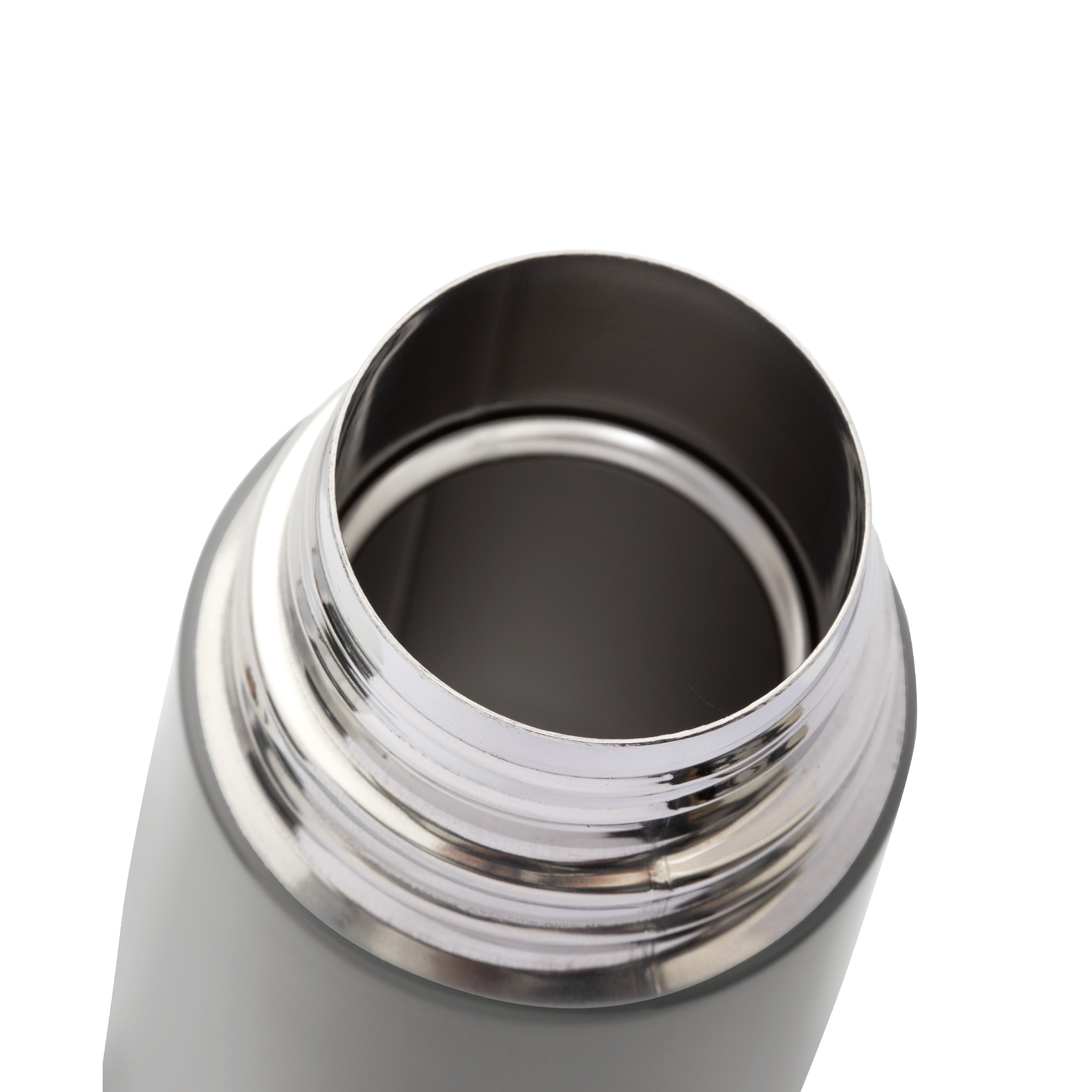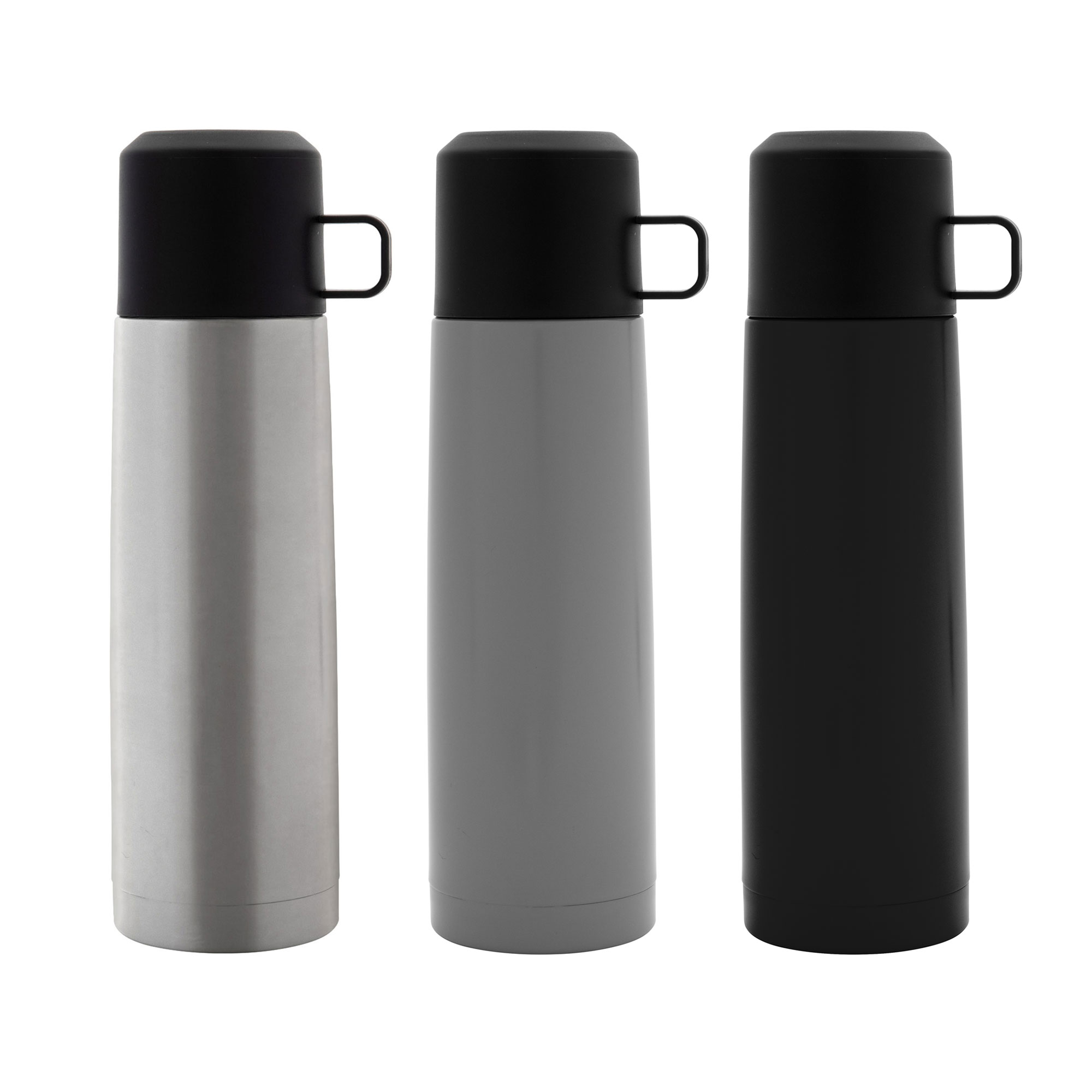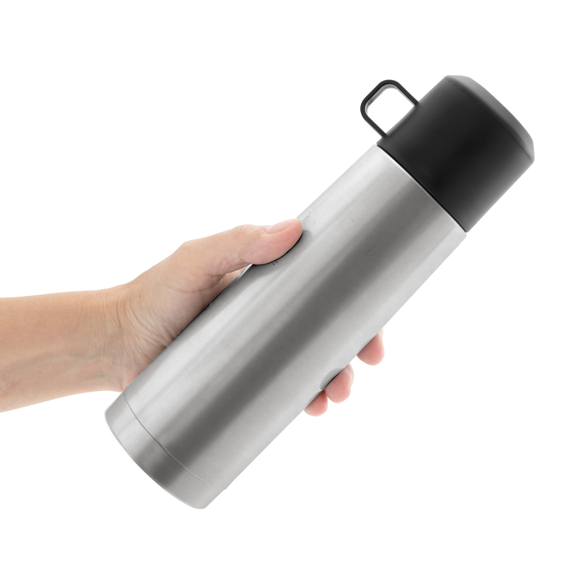 Termo con doble pared sellado al vacío. Tecnología vacuum. Acero inoxidable 304 interior / 201 exterior. Tapa y taza plásticas en color negro. Pintura acabado mate. Mantiene hasta 6 hs la temperatura de las bebidas calientes y 12 hs de las bebidas frías.