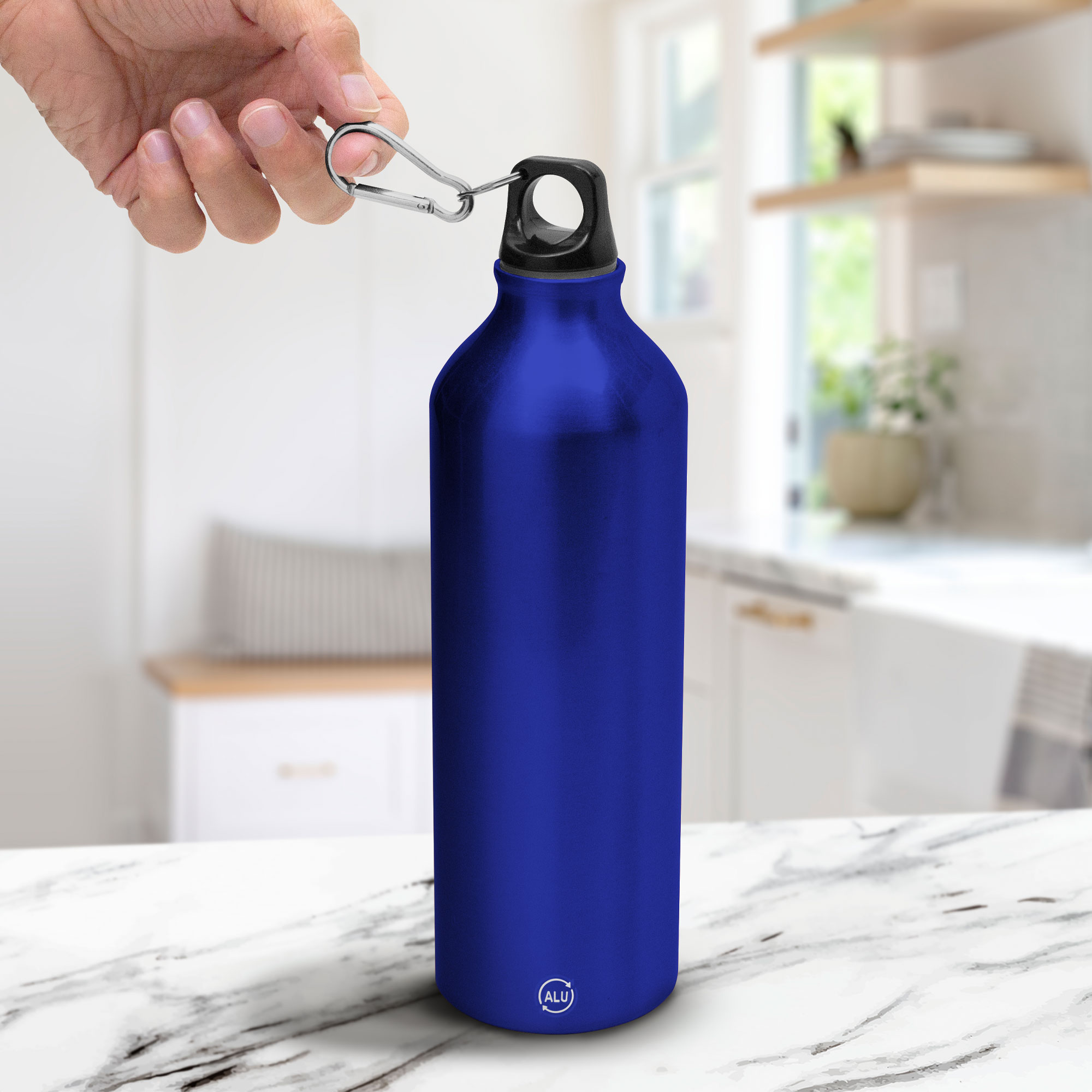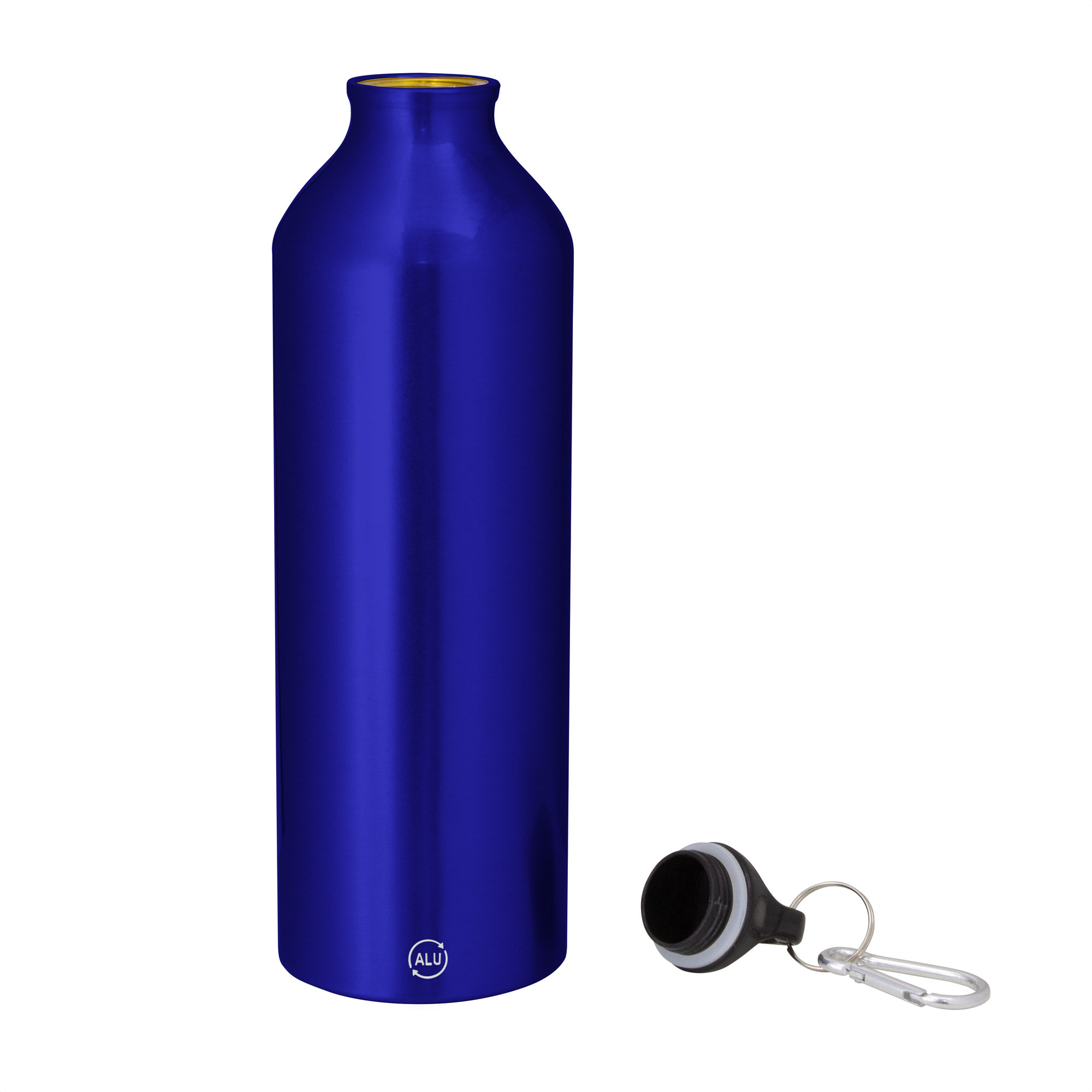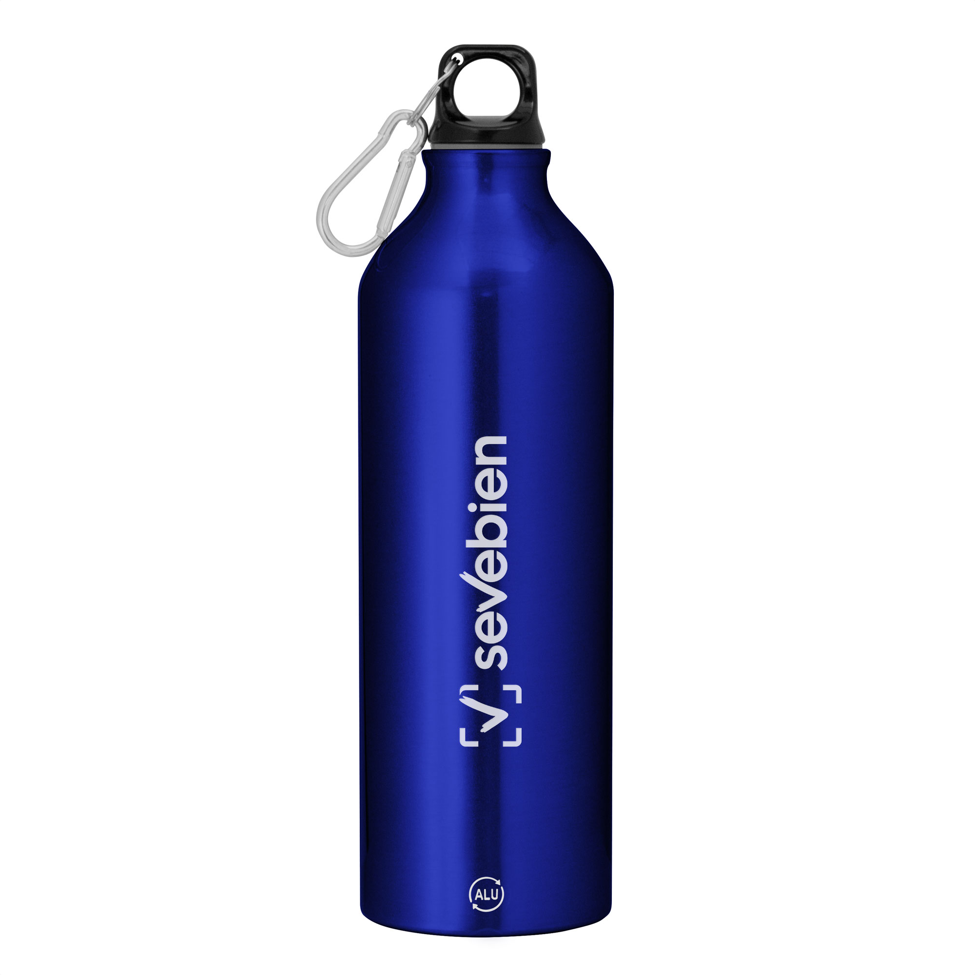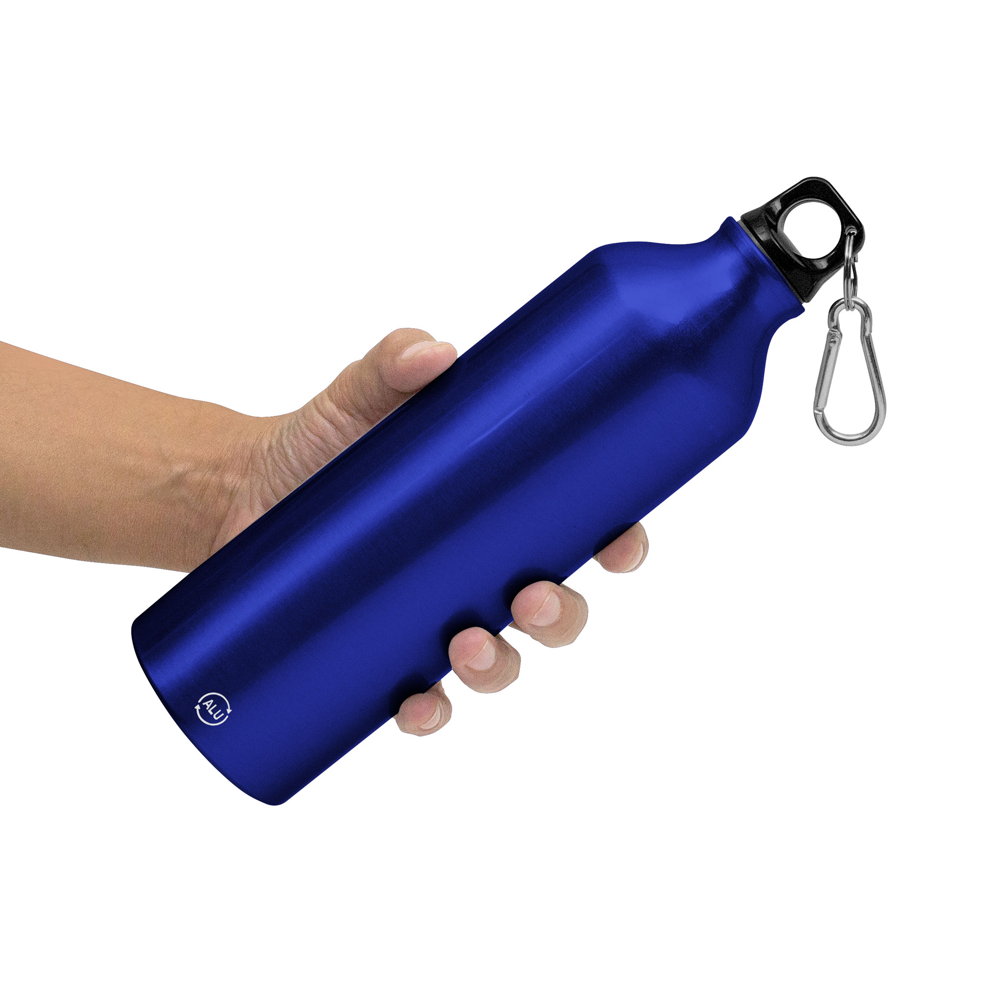 Botella de aluminio reciclado. Tapa a rosca plástica con anillo de silicona y con mosquetón (gancho carabinero) en color plateado.