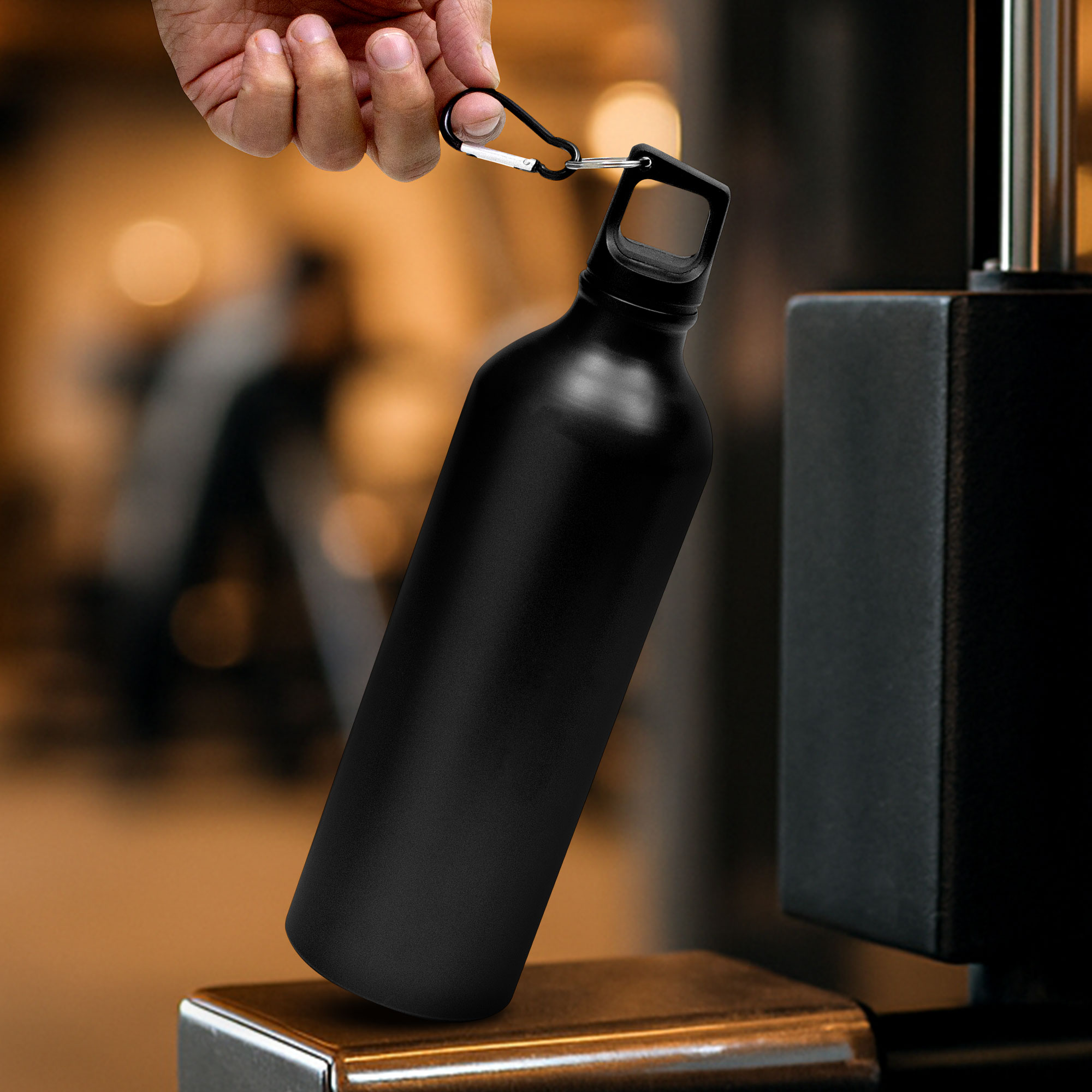 Botella de aluminio. Tapa a rosca plástica con anillo de silicona y con mosquetón (gancho carabinero) en color negro. Pintura color negro acabado mate.